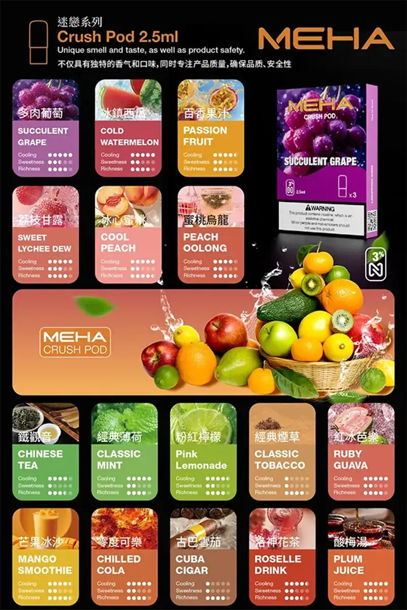 MEHA魅嗨煙彈,16種口味任選,單顆容量2.5ml,適配五代主機。限時活動:買四盒即送主機一台(方型主機)!
